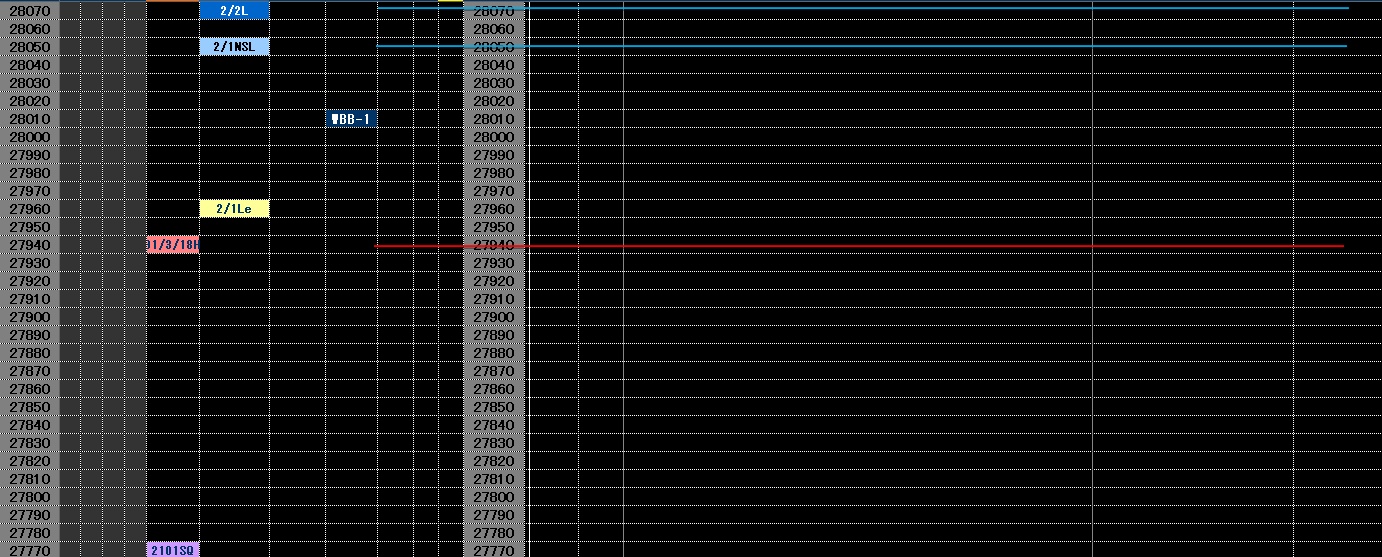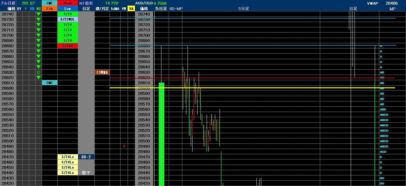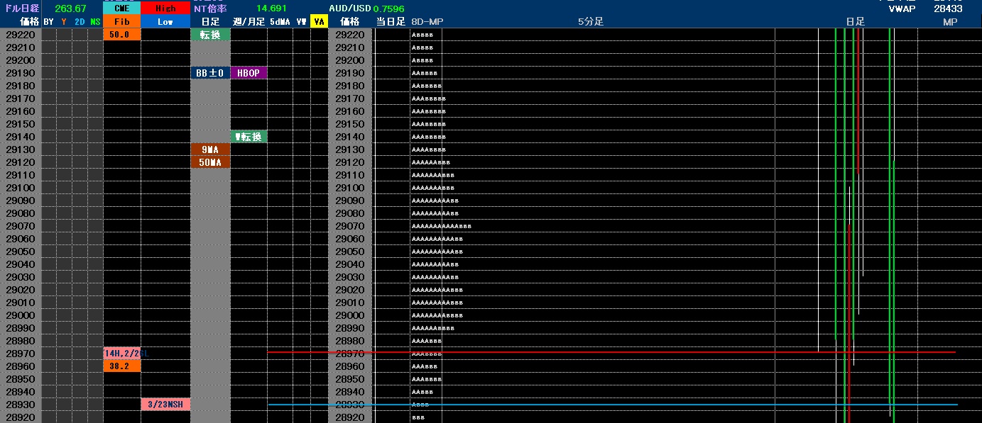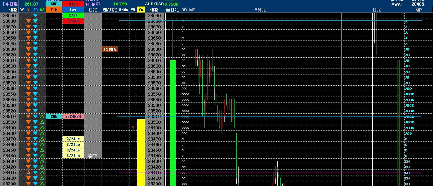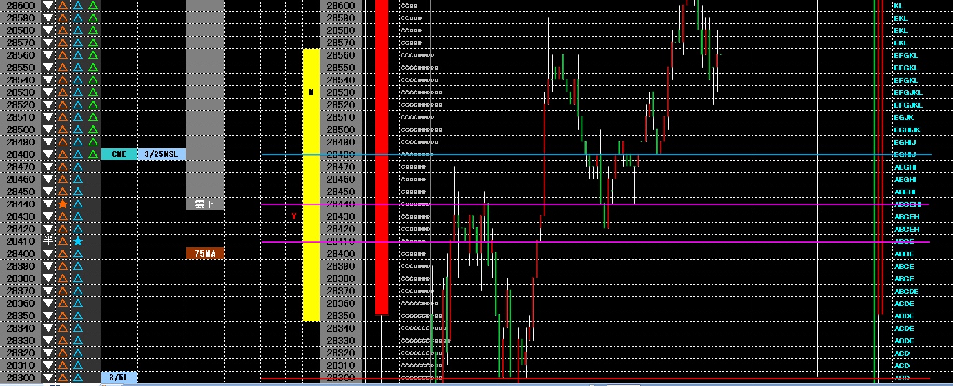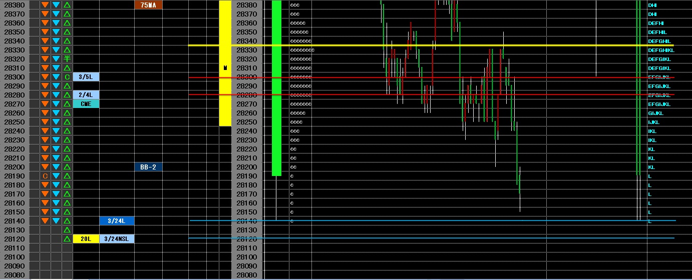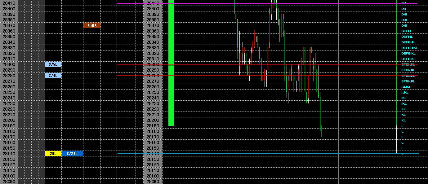 前日のNY市場は、引き続き企業業績良化期待、追加経済対策による景気回復期待、金利上昇懸念の後退も原油価格下落、「一部の資産価格はやや高い」とのFRB議長発言が重荷となって売り優勢の展開に。これを受けた東京市場寄り付きは下窓を示現。CME清算値28680円、ナイトセッション安値29620円を下回る28610円からの始まり。寄り付き後は開けた窓を残して下げ幅を拡大。断続的な売りに押されて28480円まで下落する展開に。中盤以降は、下げ幅拡大から日足雲下限、75日線を割り込んで28150円まで急落。前日比620円安の28190円引け。